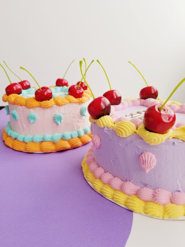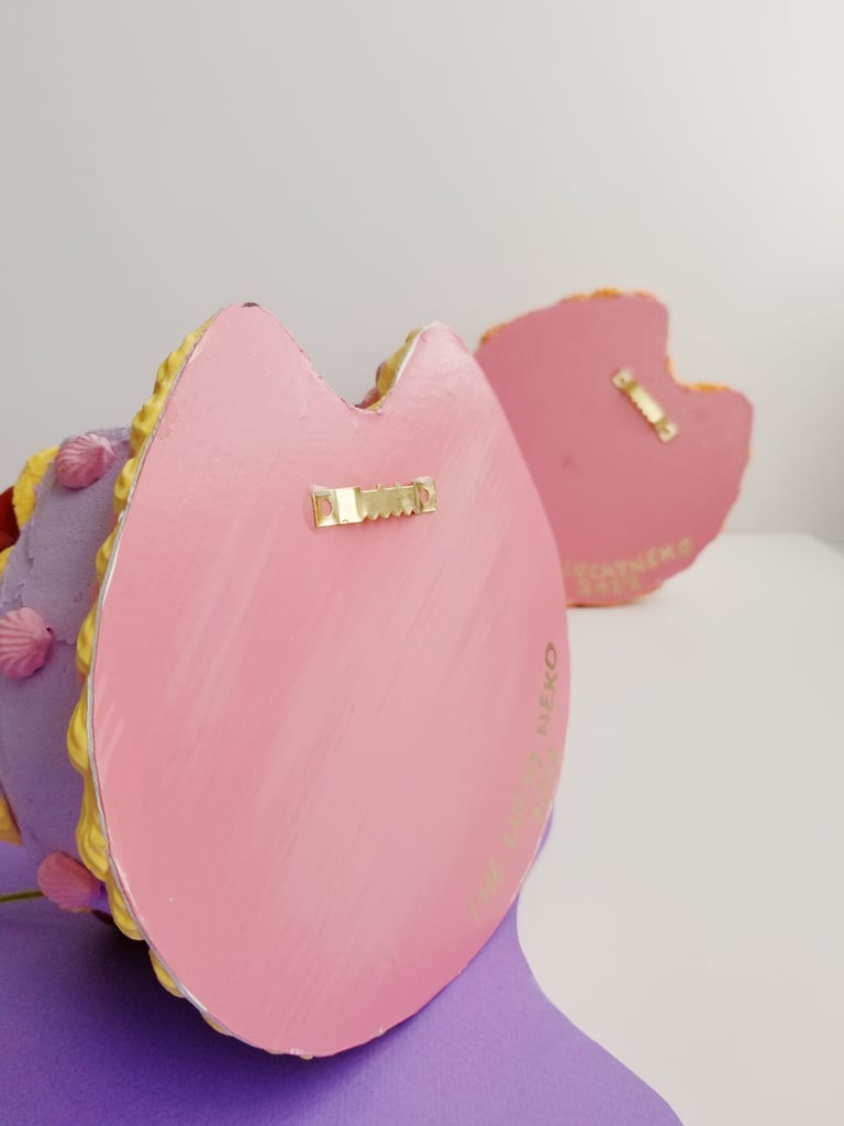 Kitty Cakes are fake cakes made with a custom handmade cat shaped base. It's then covered in plaster to resemble a real cake. The cakes are fairly light and come wall ready with adhered sawtooth hangers.